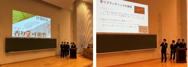 ビジネス研究部は今年度も全団体のトップバッターで、「香りの可能性」というテーマで発表しました。香料の果たす役割や最新のデジタル技術、今後可能になってくる香りのビジネスなどについて調査研究しました。