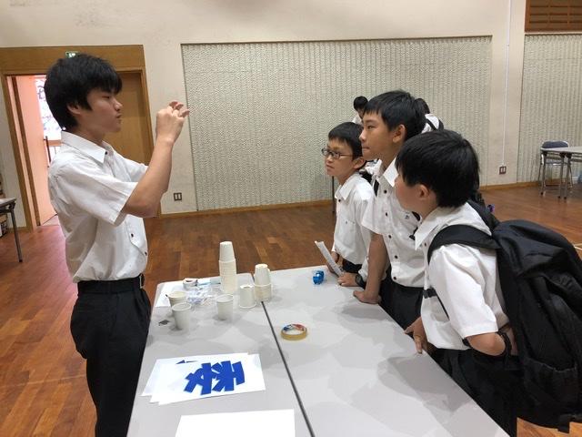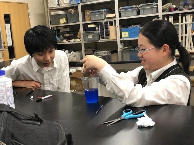 郁秋祭では、講堂と化学室の2カ所で「サイエンス縁日」と題して実験イベントを行いました。スライムやバスボム、偏光板万華鏡など3つのブースを回ってもらい、最後にキーワードを言ってもらうという内容でした。