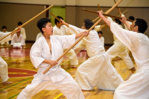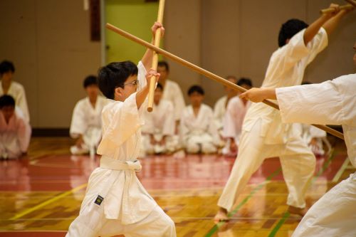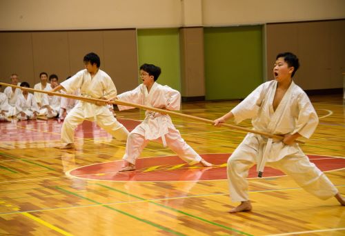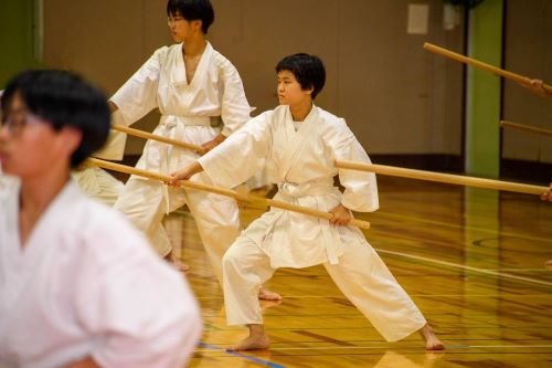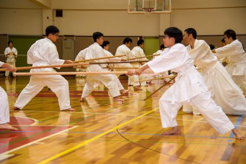「棒術部」ですが、突き・蹴りなどの素手の技や型もあります。組棒では棒と棒のぶつかる激しい音が静まりかえった体育館に響き渡ります。静から動へ。動から静へ。悔いの無い演武ができたでしょうか。