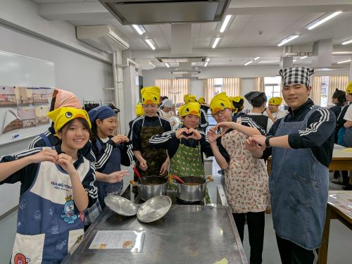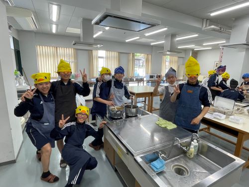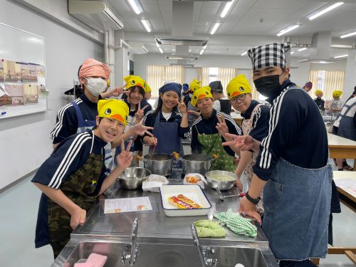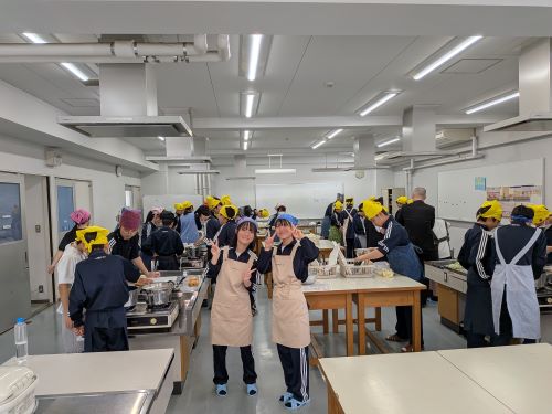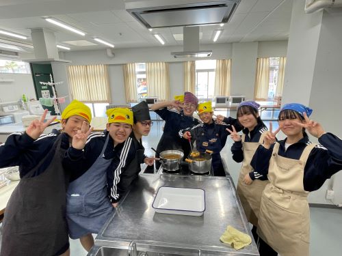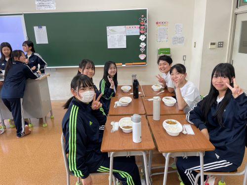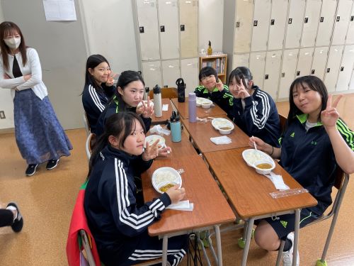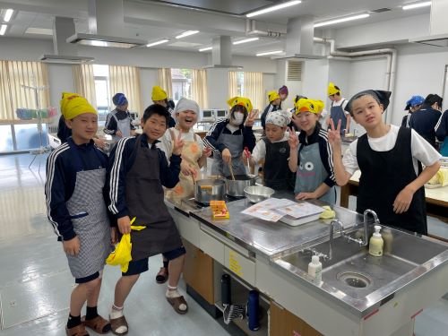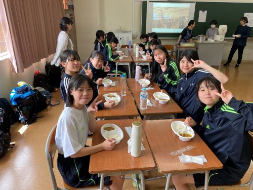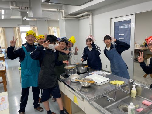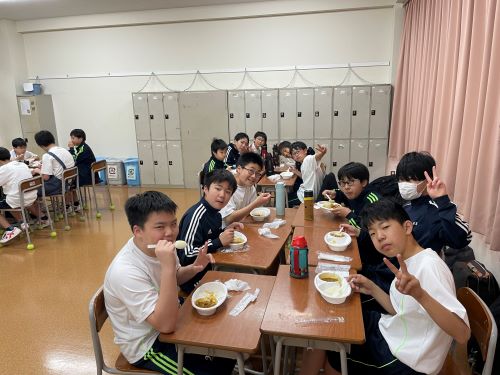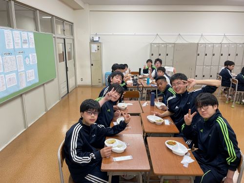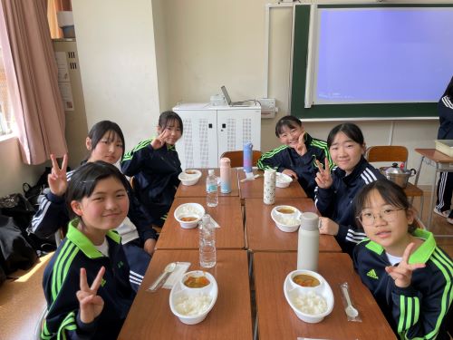 その中でも特に注目すべきは中2生徒のカレー作りでした。家庭科室から漂ってくるおいしそうな匂い、楽しげな声、通行する多くの生徒が(いろいろな意味で)惹きつけられていました。完成後は中1諸君を招待して、中1と中2が一緒になってランチタイムを楽しみました。中1にとってはおいしいカレーを食べながら先輩たちとの距離も近くなる、とても嬉しい時間であったと思います。中2にとっては料理の腕を上げることと、後輩たちに自分たちの〝実力〟を見せつけること、二つが同時にかなえられる充実した時間であったことでしょう。盛りつけをする中2諸君はちょっとかっこよかったと思います。1