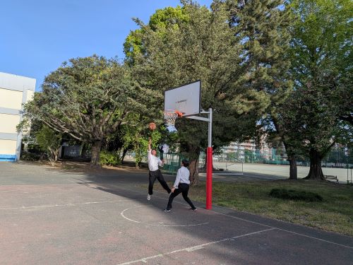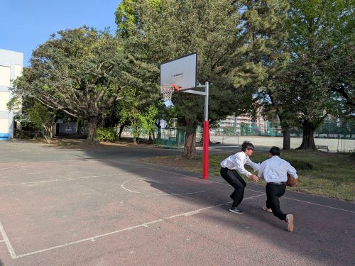 前庭での自由時間。少しラフに着ていた制服を「きちんとした方がいいですよね」と言って自ら整えてくれました。そしてジャンプ!