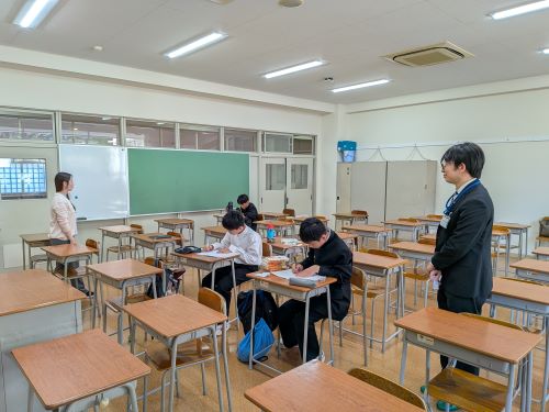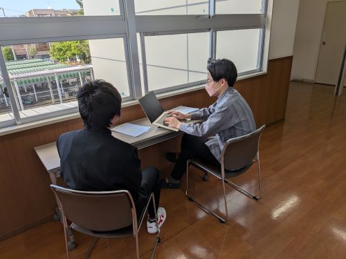 職員室内の相談カウンターで個別指導中。ちょっとのつもりが意外と長い時間になることもしばしば。明法あるあるです。