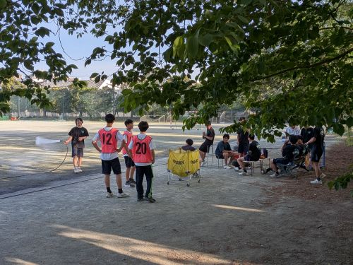 少し暑さを感じるようになったグラウンドです。練習の合間にほっと一息。スポーツ飲料を飲んだり、水をまいたり…、水分、大事です。