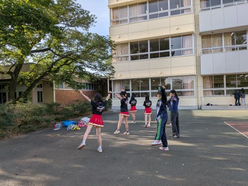 美しくかわいらしい、「頑張る明法生を応援する」ために、厳しい練習に打ち込みます。ポンポンを持つとさらに華やかです。