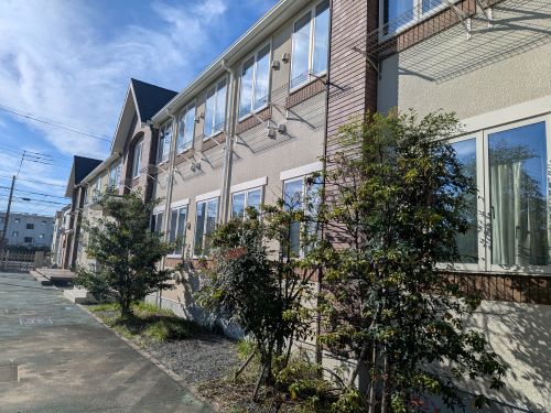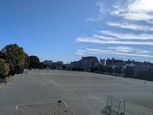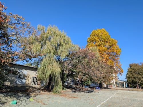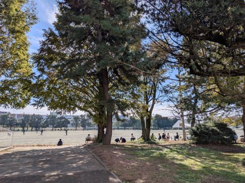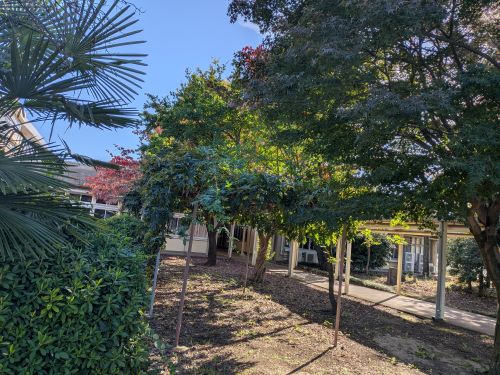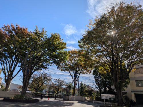 第1グラウンド西側、部室棟の前には桜の木が並んでいます。夏の暑さから生徒を守る木陰をつくり、春には見事な桜の景色を見せてくれます。食堂前にも桜の大木があり、毎年入学式の頃に満開となります。理科棟や体育館の周囲にはやや小ぶりな木々が多く、藤棚や紅梅が季節ごとの趣を演出します。第2グラウンドの東側には大きなイチョウの木があり、もう少ししたら美しい黄葉を見せてくれます。落葉後に地面に出現する黄色いじゅうたんも見事なものです。