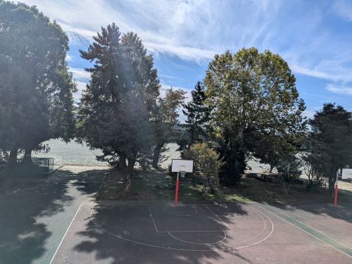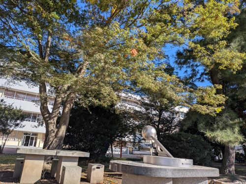 前庭のフリースペースでは、昼休みの遊びや放課後の課外活動に取り組む生徒たちの姿が見られます。第1グラウンド北側には日時計や休憩用のスペースが設けられ、のんびりとした雰囲気が漂っています。理科棟を囲む池には周囲の景色が映り込んでいます。