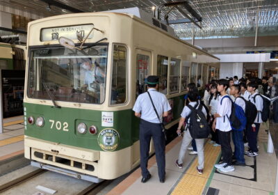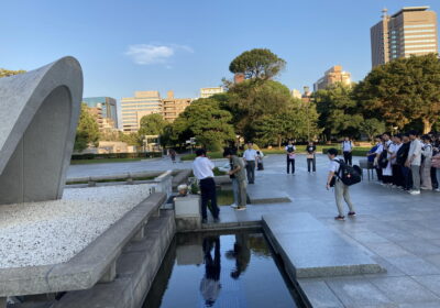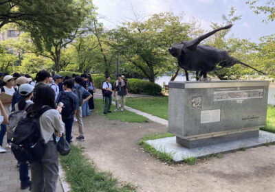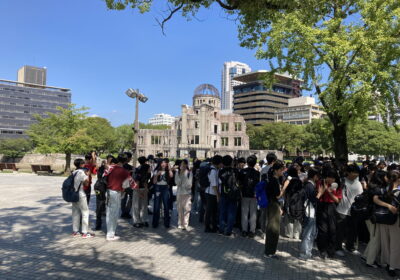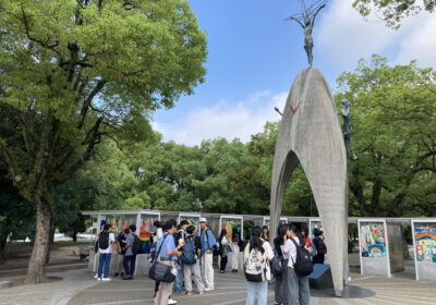 広島では、原爆資料館を見学し、証言者の方から被爆体験のお話を伺い、慰霊碑に献花、「原爆の子の像」学年で作った千羽鶴を捧げました。現地を訪れて平和学習に取り組みました。