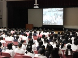 | 大学案内を手に説明を聞く生徒たち。 | 谷崎学長。「皆良い先生、是非会いにお出かけください」とお話くださいました。 | 大学紹介のビデオをスクリーンで見る。 |