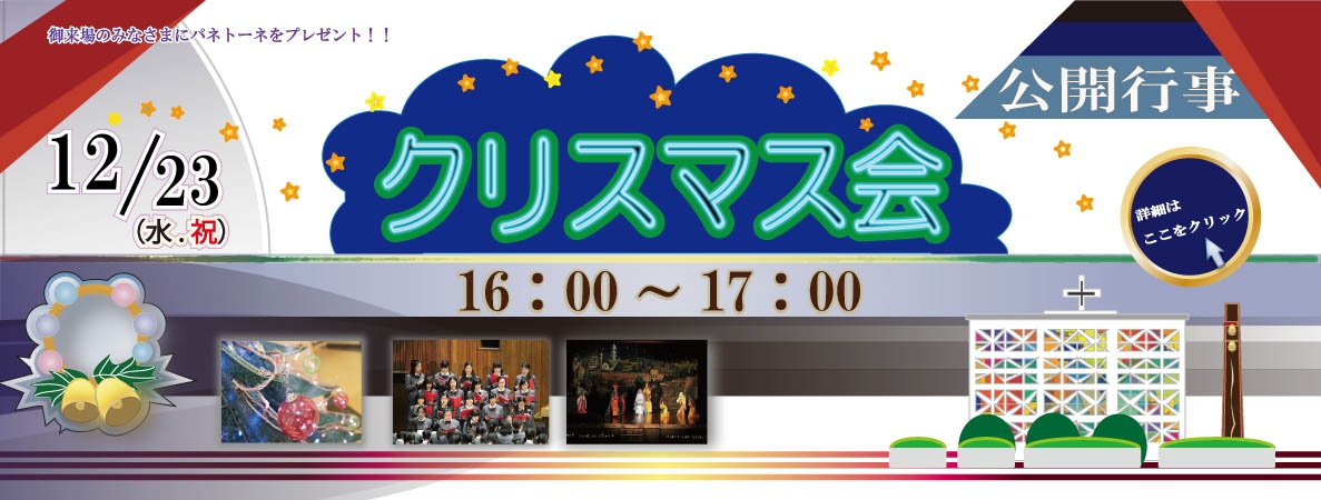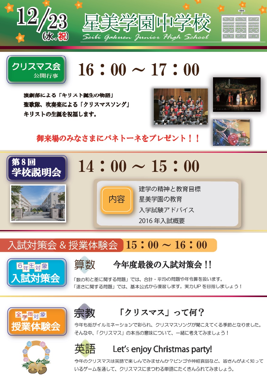 12月23日(水・祝)クリスマスイベントを行います。 投稿 2015年12月01日 10:00 12月23日(水・祝) 14:00~15:00 学校説明会 15:00~16:00 小学6年生対象 入試対策会・全学年対象 授業体験会 16:00~17:00 クリスマス会 ※授業体験会は、「宗教」または「英語」の教科です。 小学6年生対象 入試対策会は、「算数」です。 詳細は、こちらからご覧ください。ご予約をお待ちしております。 星美学園で学んで、クリスマス会で楽しみませんか。 lineで送る シェアする ポストする メールで送る