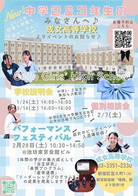 【1/24(土) 14:00~】第11回学校説明会を開催いたします! 開催日時 2026/01/24 終日 成女学園中学校・成女高等学校の学校説明会を1月24日(土)14時より実施いたします。 ◆内容:教育内容の説明・個別相談など ご予約は本校HPよりお願いいたします。 予約ページ:学校説明会予約フォーム