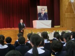 9日、学園創立者濱野重郎先生を偲ぶ会が行われました。今年は雨のため学園講堂で、幼稚園、初等部、中等部それぞれでの開催になりました。今年は重郎先生の生誕118年目に当たります。浅野理事長のお話の後、初等部鳥羽教諭が、私たちが学園で生活できることの“奇跡”についてのお話をし、濱野先生への感謝の気持ちをあらたにしましょうと子どもたちに語りかけました。「創立の精神」は私立学校の教育の根本となるものです。濱野先生が創られた学園の理念を、後進の私たちがしっかりと継承、発展していこうと誓い合いました。